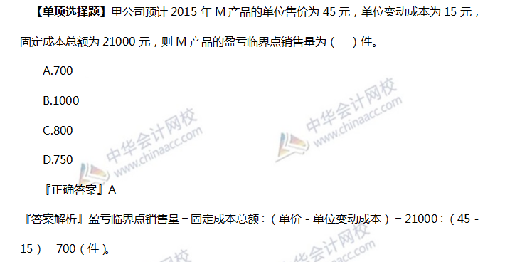 关键考点:盈亏临界点销售量的计算