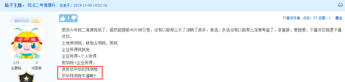 好多同学反馈,今年税法二考试好多题都类似网校的模拟题!希望接下来的科目考试也能简单些,希望自己能过。