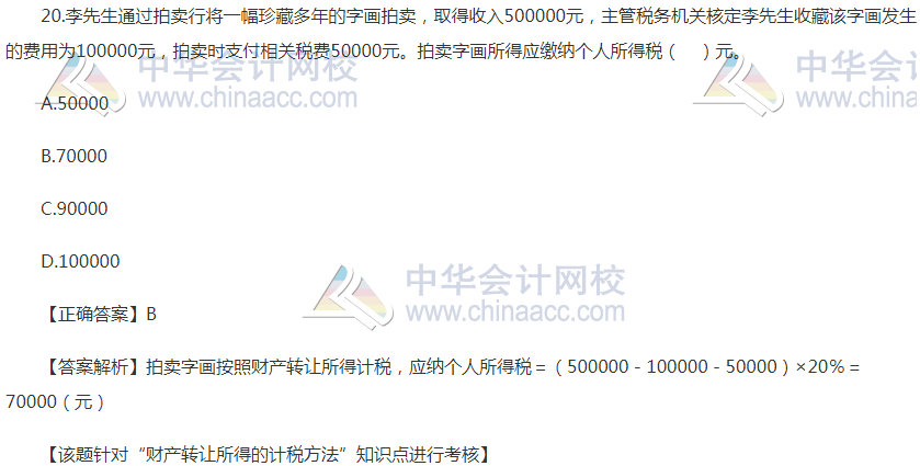 成功很多就是熬,在认定的方向上是否打得够深、够细,税务师考试考查知识点非常细,这就需要我们平时复习,要细心些,且巩固好基知识,平时可通过多做题加深知识点的印象。正保会计网校小编给大家更新2020年税务师《税法二》精选练习题,考查财产转让所得的计税方法知识点,赶快练习。
