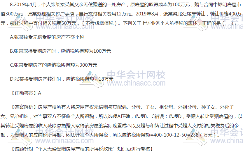 税务师备考是一段漫长、艰难的历程,期间会备受煎熬,忍受寂寞,但是当我们取得好成绩的时候,一切辛苦都不算什么。为了帮大家巩固基础,小编为大家带来2020年税务师各科目精选练习题,如下为2020年税务师《税法二》精选练习题,考查个人无偿受赠房屋产权的所得税政策知识点,做完了可以看看答案解析。
