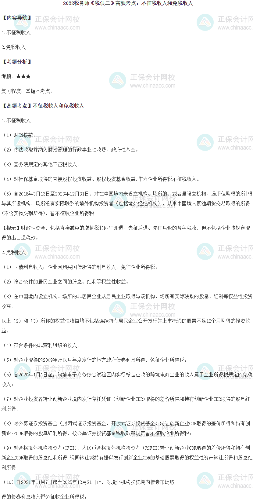 税务师考试有不少近几年出现频次较高的知识点,需要咱们考生重点记一记,正保会计网校整理了2022税务师《税法二》各章高频考点,先看看2022税务师《税法二》第一章高频考点:不征税收入和免税收入。