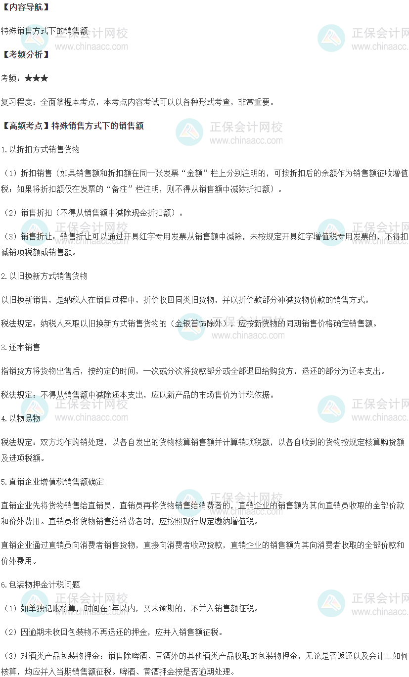 税务师考试近年来经常考到的知识点,需要我们好好复习!正保会计网校给大家整理了2022年税务师《税法一》各章高频考点,下面是2022税务师《税法一》第二章增值税高频考点:特殊销售方式下的销售额。