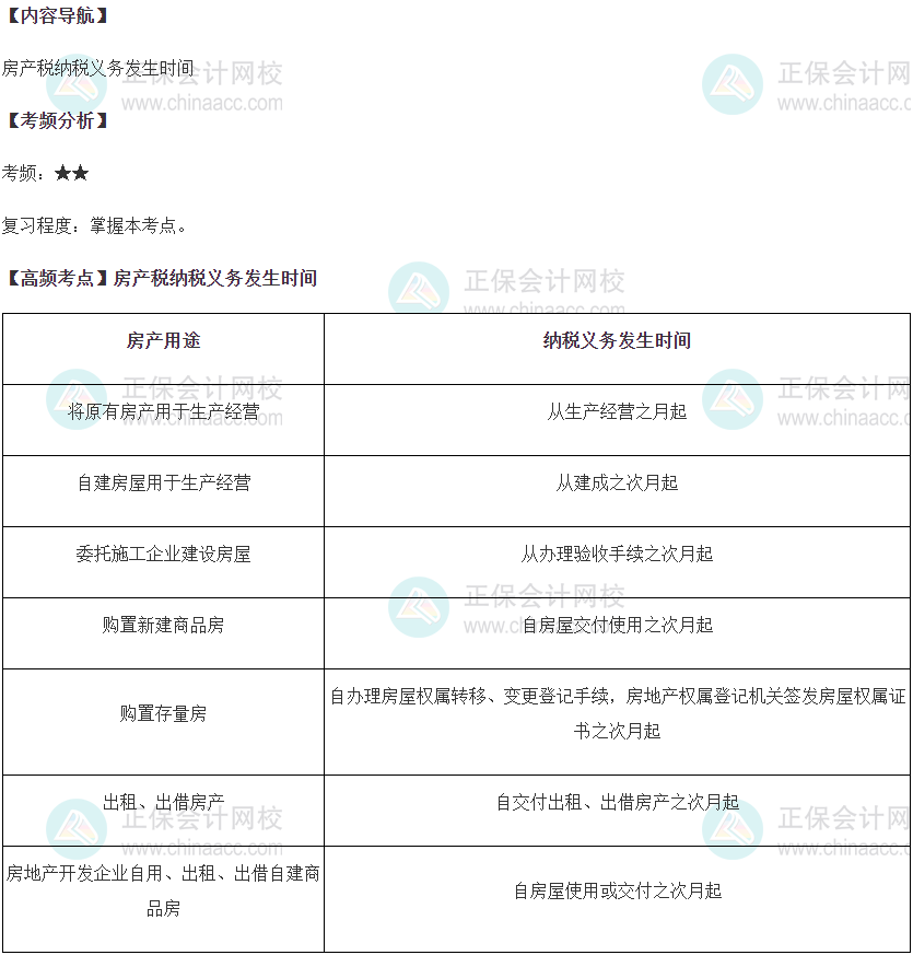 正保会计网校整理好2022年税务师各科高频考点,帮各位考生梳理税务师各科目重点,历年经常考到的考点,务必好好看看!下面更新2022年税务师《税法二》第五章房产税高频考点:房产税纳税义务发生时间,快检查下自己掌握了没。