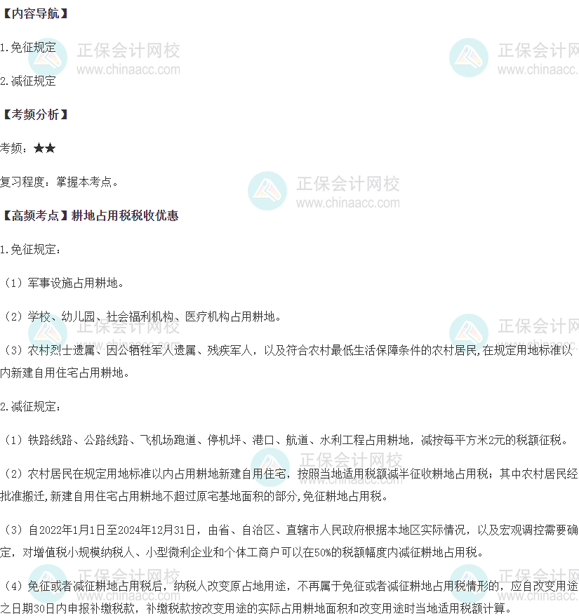 税务师《税法二》整体难度适中,备考需抓重点、抓考点,近几年税务师考试高频考点要好好看看。下面更新了2022年税务师《税法二》第九章耕地占用税高频考点:耕地占用税税收优惠,快看看吧。