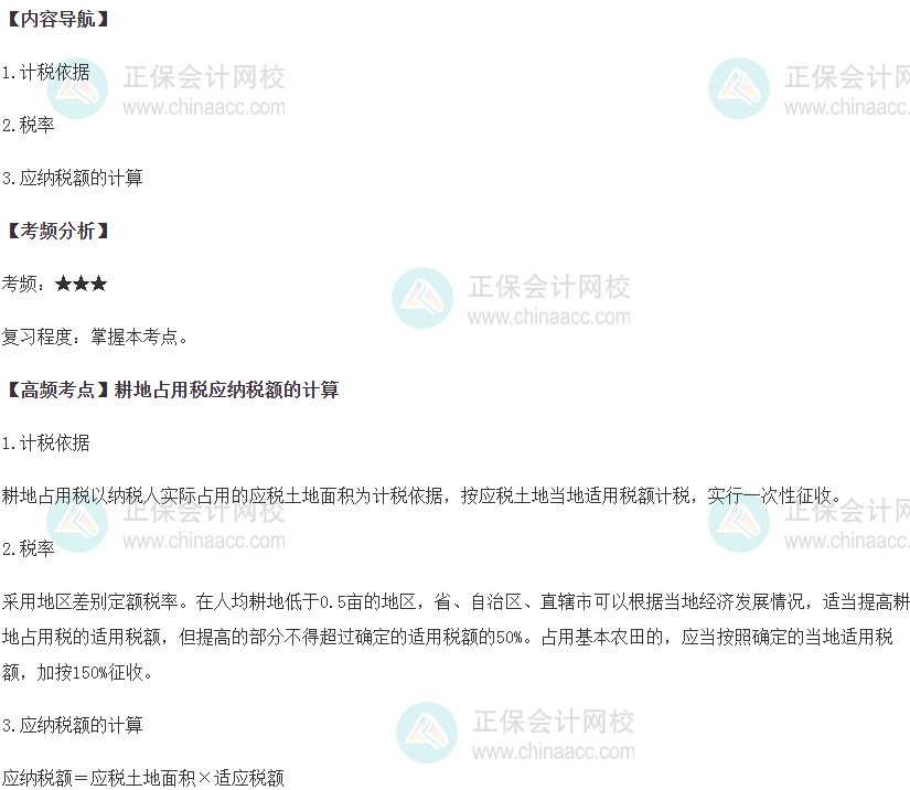 税务师考试不会超出考试大纲要求的范围,但税法二知识点多,考得细,大家平时复习得抓重点。正保会计网校给各位考生整理好2022税务师《税法二》高频考点,下面更新了2022年税务师《税法二》第九章耕地占用税高频考点:耕地占用税应纳税额的计算,快看看。