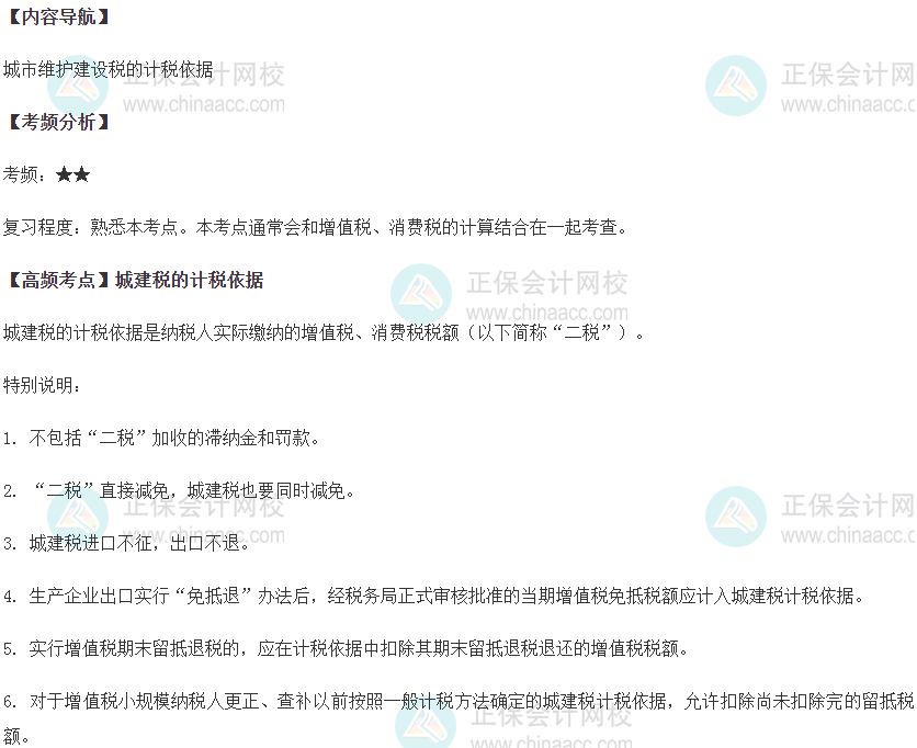 税务师考试总有一些知识点,常年考,网校整理的2022税务师考试高频考点,要好好看看!下面更新2022年税务师《税法一》第四章城市维护建设税、教育费附加及地方教育附加高频考点:城市维护建设税的计税依据,好好看看,熟练掌握!