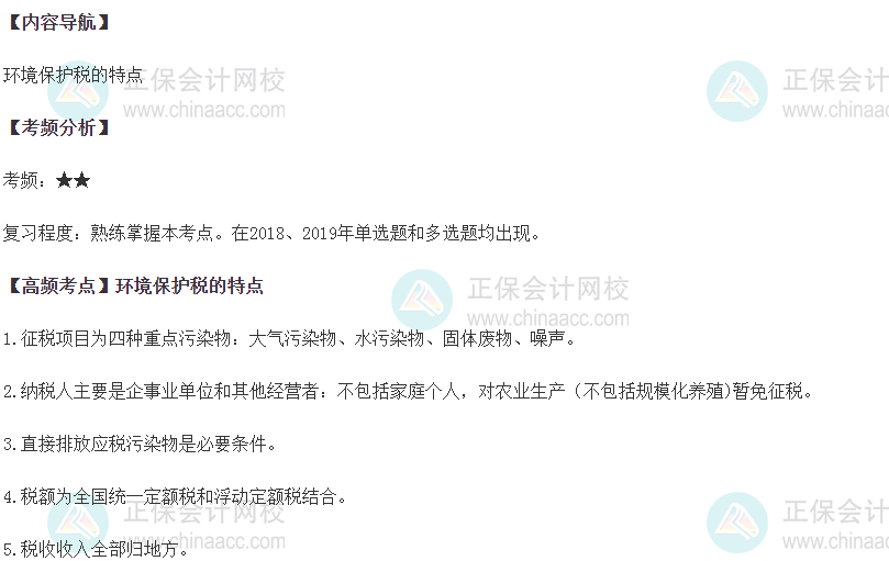 2022年税务师考试前重要的复习冲刺时期,大家要把握好重点知识,网校给考生整理了近年来税务师考试高频考点,下面带来2022税务师《税法一》第八章环境保护税高频考点:环境保护税的特点,请好好看看知识点解析,要重点掌握该知识点。