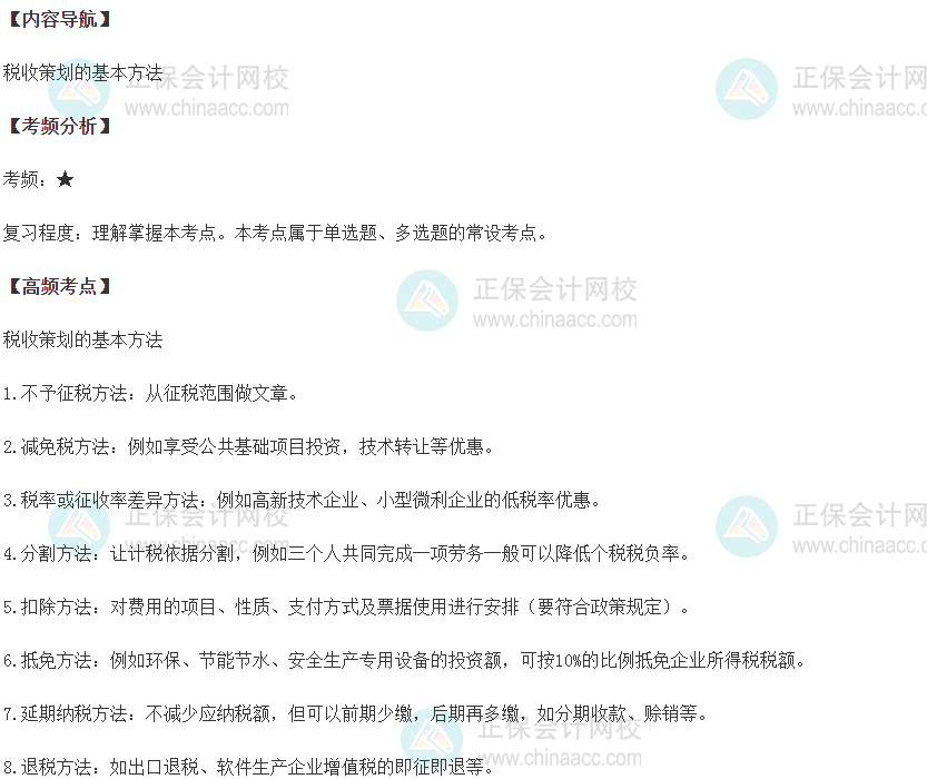 2022年税务师考试前冲刺的重要阶段,要抓重点、巩固基础,掌握好高频考点很关键!下面更新2022年税务师《涉税服务实务》第七章税务咨询服务高频考点:税收策划的基本方法,快好好复习!