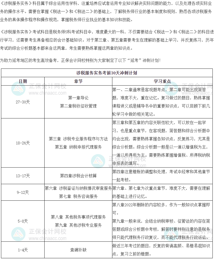 2022年税务师第二次延期考试时间为2023年3月18日至3月19日,距离再延考还剩一个多月时间,如何安排这段时间的学习重点呢?正保会计网校带来2022年税务师《涉税服务实务》考前30天冲刺计划,参加第二次延考的小伙伴们好好看看,加油冲刺!