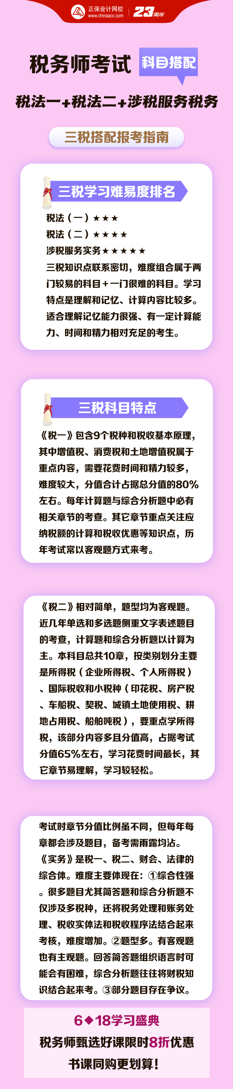 备战2023年税务师考试,很多人选择第一年报考三科,选择“三税”是比较常见的科目搭配。那么,三税科目特点、难易度如何、适合哪类人群报考呢?