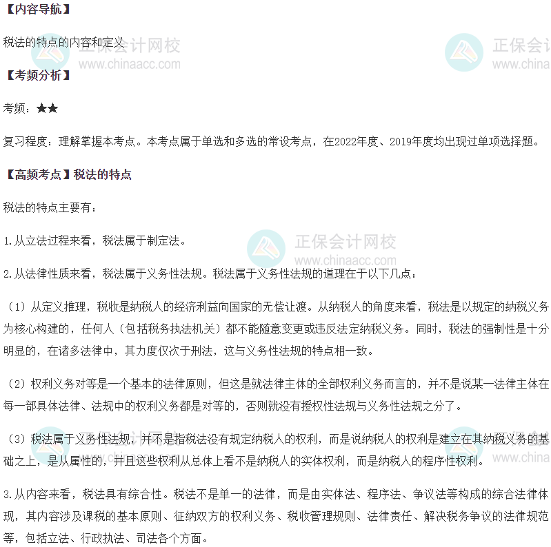 税务师《税法一》知识点理解起来难度不大,但备考内容多而碎,需要抓住重点。正保会计网校老师给大家整理了2023年税务师考试《税法一》高频考点,以下是2023税务师《税法一》第一章税法基本原理高频考点:税法的特点,赶紧复习一下,看看自己掌握了没。