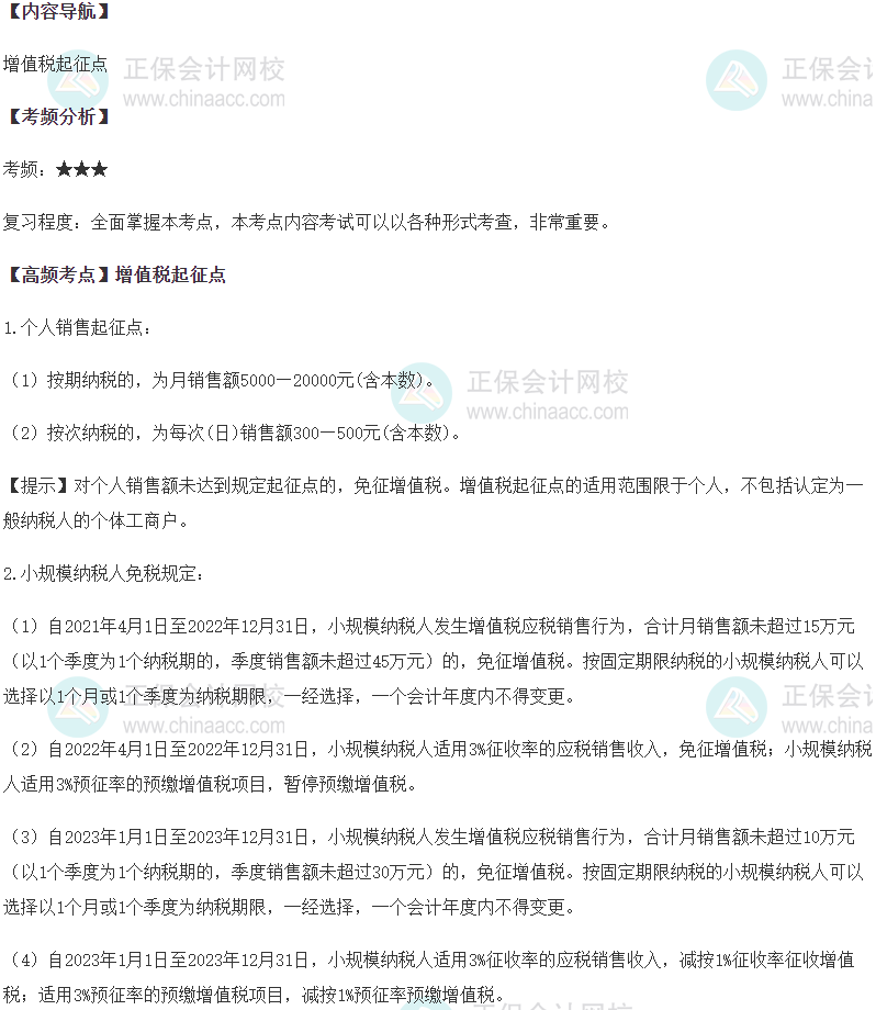 8月份开始,税务师基础课程学习接近尾声,到8月底前,希望同学们把基础知识点过一遍,9月份开始系统地刷题,10-11月份考前冲刺,查漏补缺。在税务师考试前,希望大家把近几年考试高频考点好好记一记!下面是2023年税务师《税法一》第二章增值税高频考点:增值税起征点和小规模纳税人免税规定,要重点掌握哦!