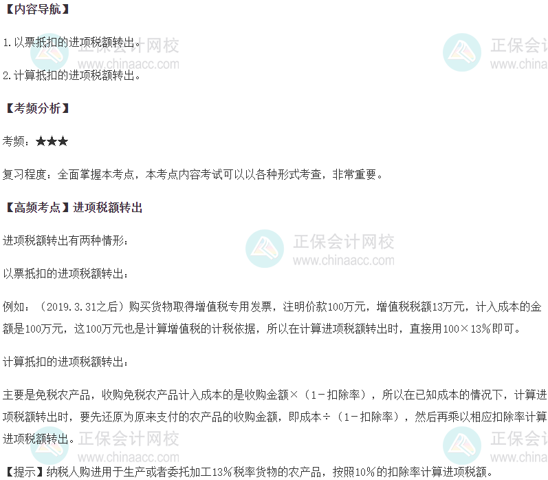 税务师《税法一》对知识点的理解相对容易,但是那么多知识点,学习任务还是很重的,建议大家尤其把一些经常考到的知识点重点复习一下!下面继续更新2023年税务师《税法一》第二章增值税高频考点:进项税额转出,请重点掌握!