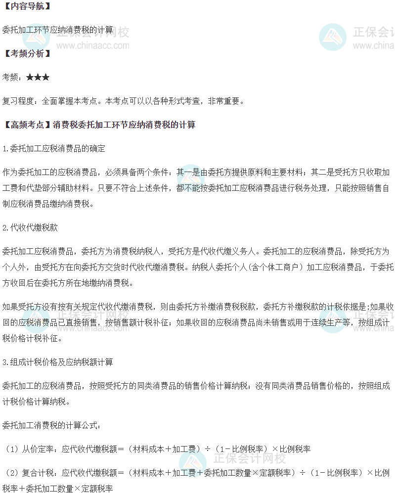 每年税务师考试经常考察大家的知识点,希望同学们复习的时候重视一下!下面是2023年税务师《税法一》第三章消费税章节的高频考点:消费税委托加工环节应纳消费税的计算,你是否掌握了呢?