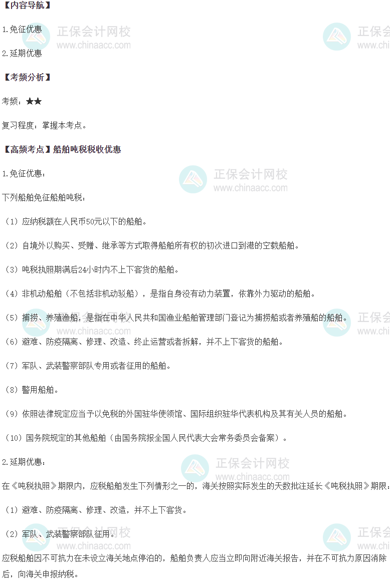 2023年税务师备考正在进行中,为帮助考生更全面更有重点地复习,网校整理了税务师考试高频考点,以下是2023年税务师《税法二》第十章船舶吨税章节的高频考点:船舶吨税税收优惠,重点掌握哦!