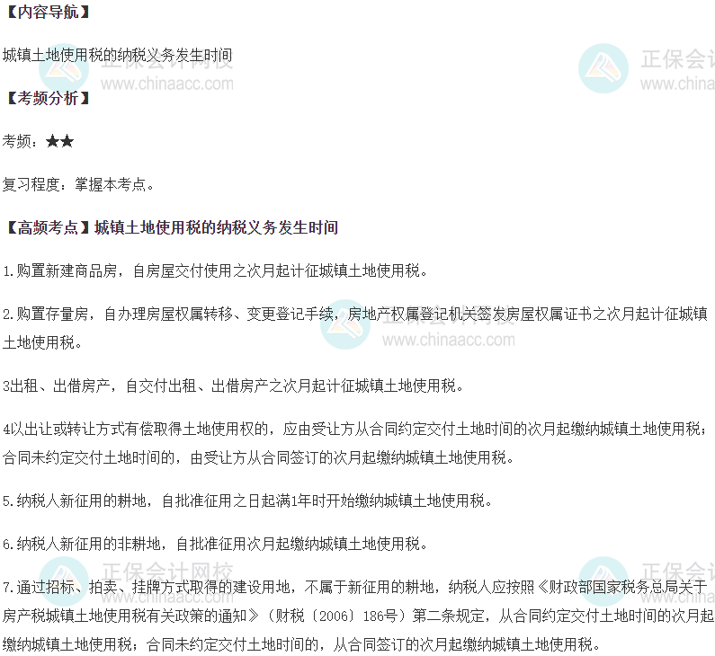 税务师考试历年高频考点,希望同学们理解透彻哦!以下是2023年税务师《税法二》第八章城镇土地使用税章节的高频考点:城镇土地使用税的纳税义务发生时间,你掌握了吗?赶快看看。