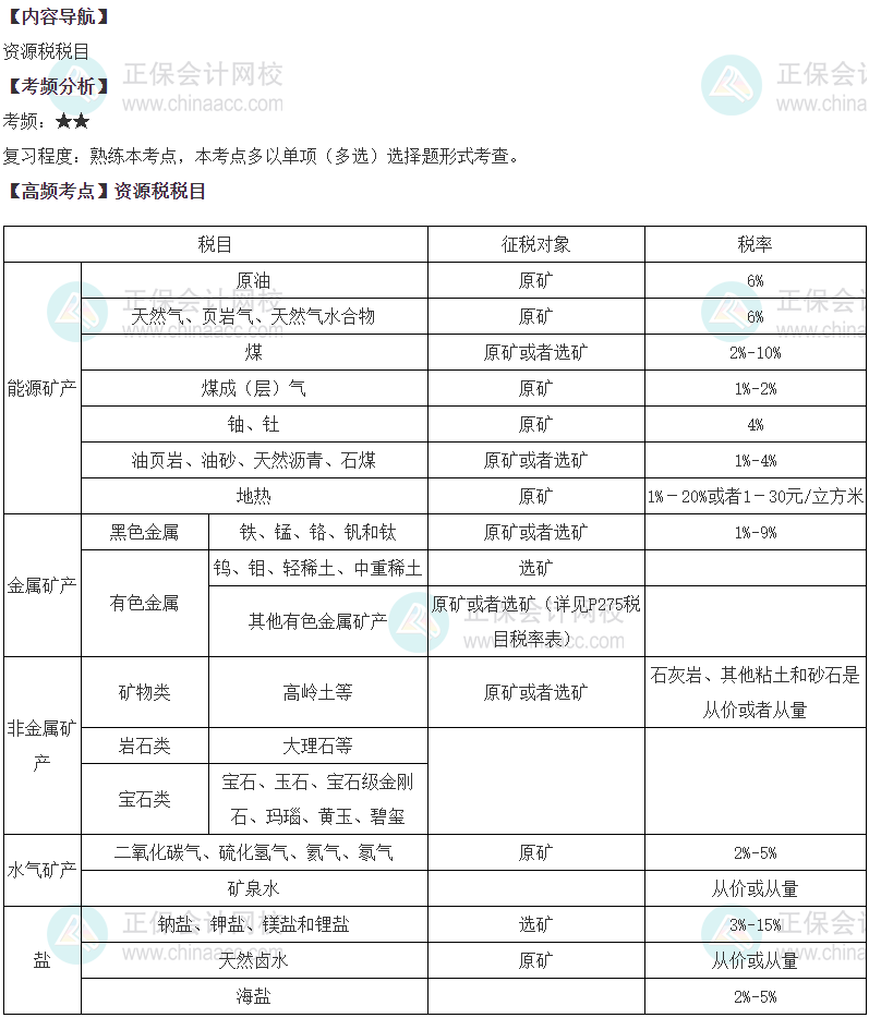 税务师备考内容繁多,知识点琐碎,税法一难度虽然不算大,但需要记忆的内容多,大家一定要全面学习、抓重点去学习。以下是2023年税务师《税法一》第六章高频考点:资源税税目,好好复习吧。