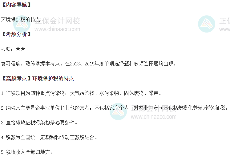 税务师考试整体来说难度不算大,需要大家把握好基础知识,尤其把高频考点好好掌握。以下是2023年税务师《税法一》第八章环境保护税章节的税高频考点:环境保护税的特点,你掌握了没?复习一下吧。