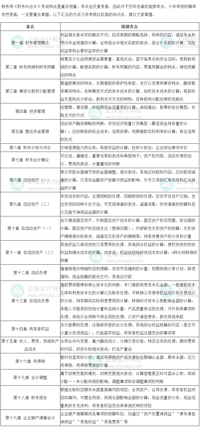 2023年税务师考试时间临近,剩下一个月时间里,大家要高效冲刺!正保会计网校给大家整理了2023年税务师考试各科目考点预测,下面是税务师《财务与会计》考点预测,赶紧看看。