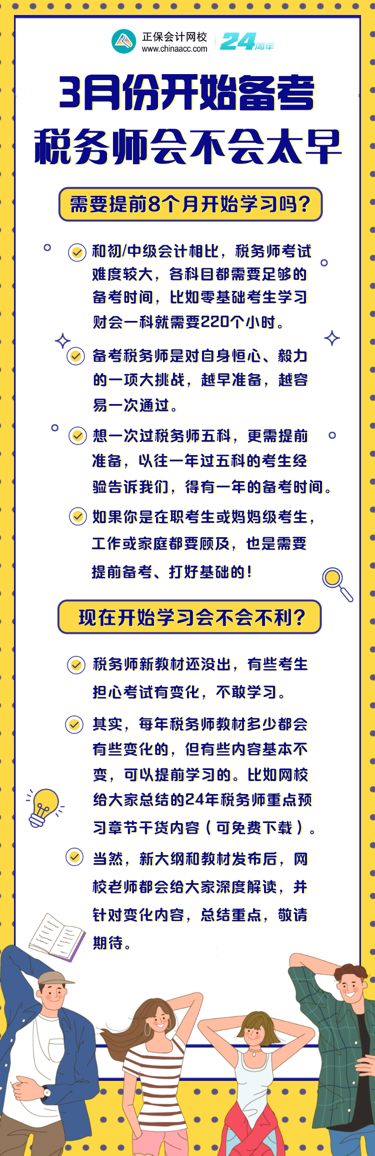 而且,2024年税务师考试时间比往年提早了十几天,学习也得提早点,赶紧为自己敲响备考的钟声吧!