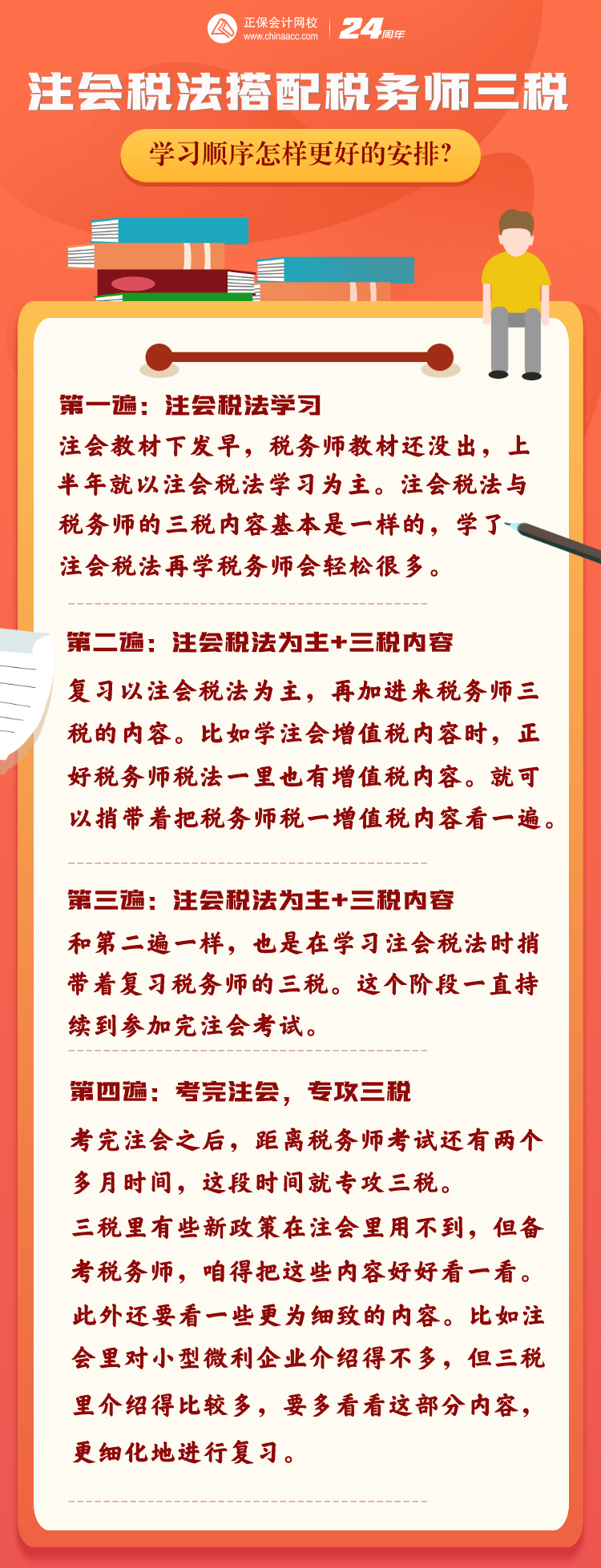 开始时先以注会为主(因为注会教材先下来,基础精讲课程也开的早),后期跟着税务师老师认真系统的学习。