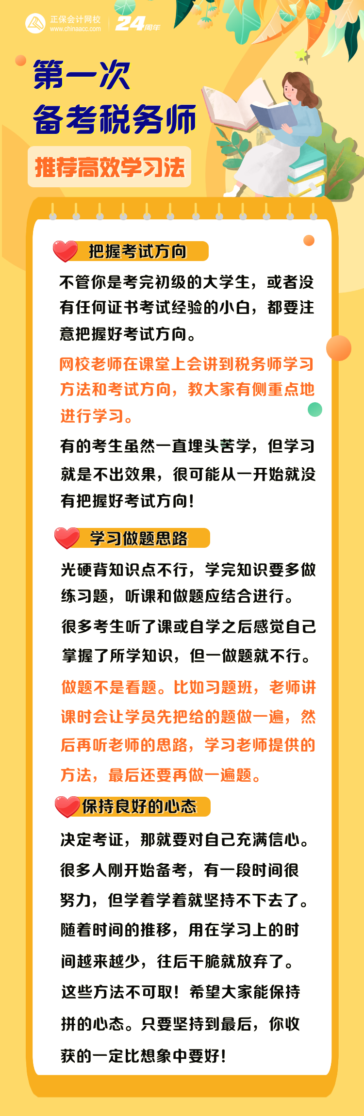 准备税务师考试的人群中,相信有不少零基础考生,第一次备考税务师,先给自己“打个预防针”:放手大胆的学、正确高效的学!那么备考税务师有什么好的学习方法呢?