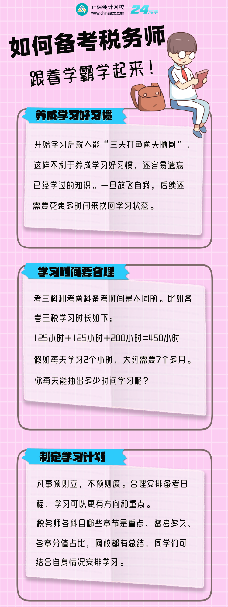2024年税务师考试时间为11月2、3日两天,3月底距离考试只有7个多月时间了,同学们准备报考几科呢?报考三科的话,至少得保证每天能有2个小时的有效学习时长哦!