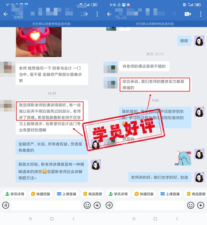 “靳焕一老师的课讲得好!有一些我以前弄不明白靠死记的内容,老师讲了原理,希望跟着靳老师不仅学习上有进步,也能对会计这门专业有更好的理解~”这是位认真好学的同学,老师也喜欢你呢!