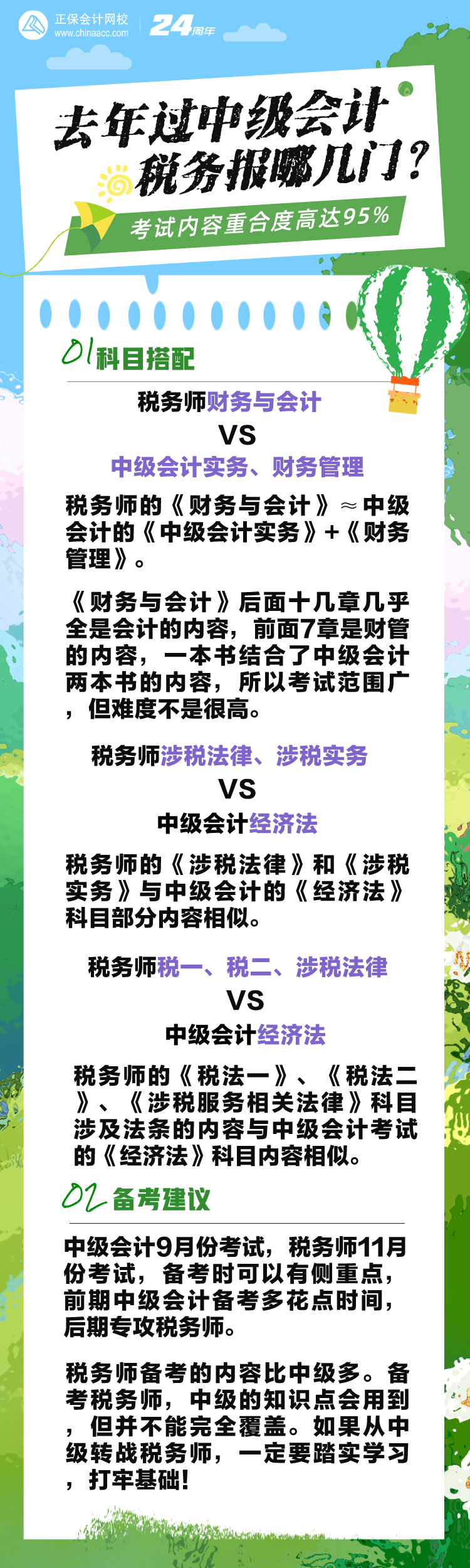 中级会计职称考试和税务师考试内容重合度高达95%,且考试时间不冲突,非常适合放在同一年一起报考,尤其是去年考过中级的同学,今年一定要“趁热打铁”备考税务师!