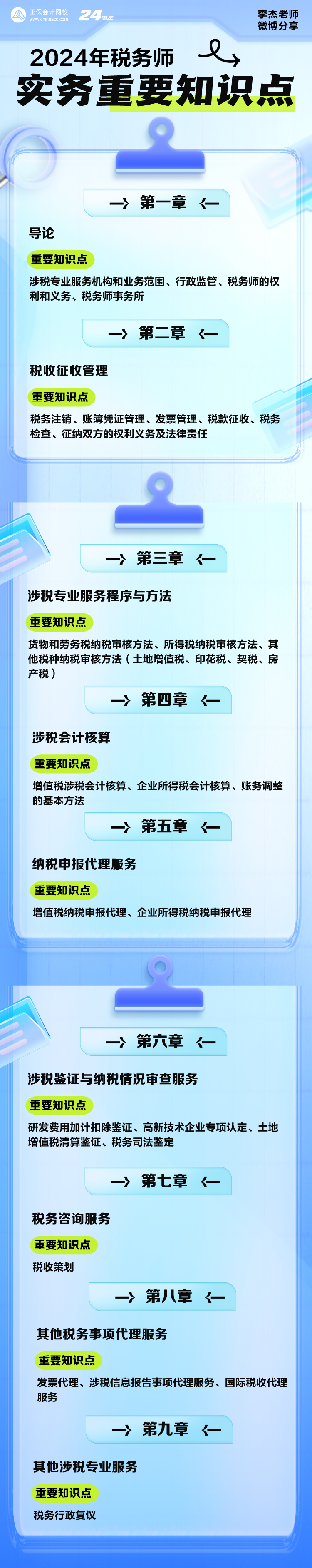 备考2024年税务师《涉税服务实务》,你知道《涉税服务实务》每章重点有哪些吗?根据2024年税务师考试大纲,李杰老师总结了2024税务师《涉税服务实务》各章重要知识点,来看看吧!