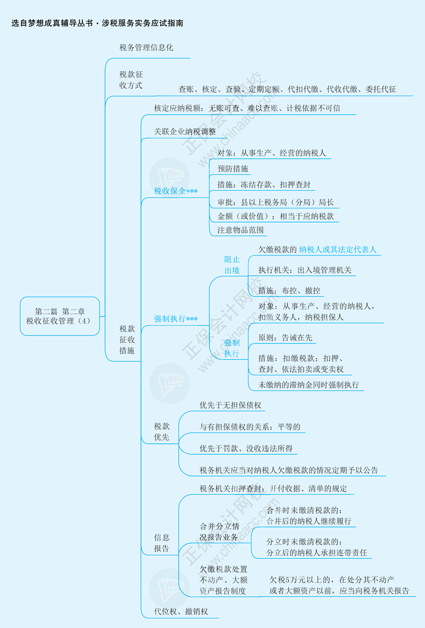 税务师考试教材很厚,涉及内容很多、很繁琐,正保会计网校整理了2024年税务师《涉税服务实务》学习思维导图,把知识点给大家串联起来,下面是2024年税务师《涉税服务实务》第二篇第二章思维导图:税收征收管理(4),学起来!