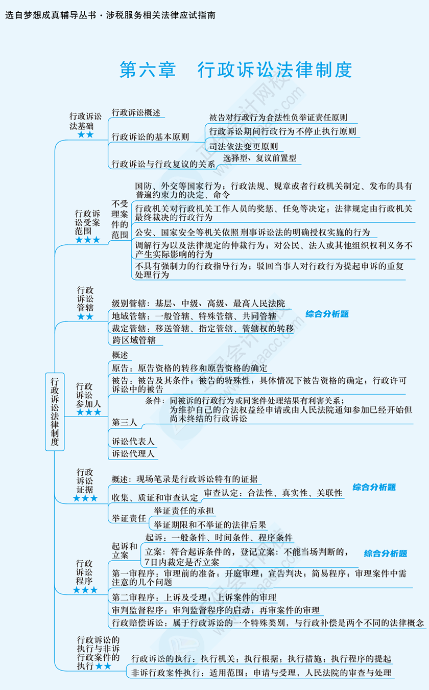 2024年税务师考试教材那么厚,怎么才能高效学习呢?别急,网校《应试指南》纸质书里面的思维导图可以帮你梳理思路。下面是2024税务师《涉税服务相关法律》思维导图第六章:行政诉讼法律制度。