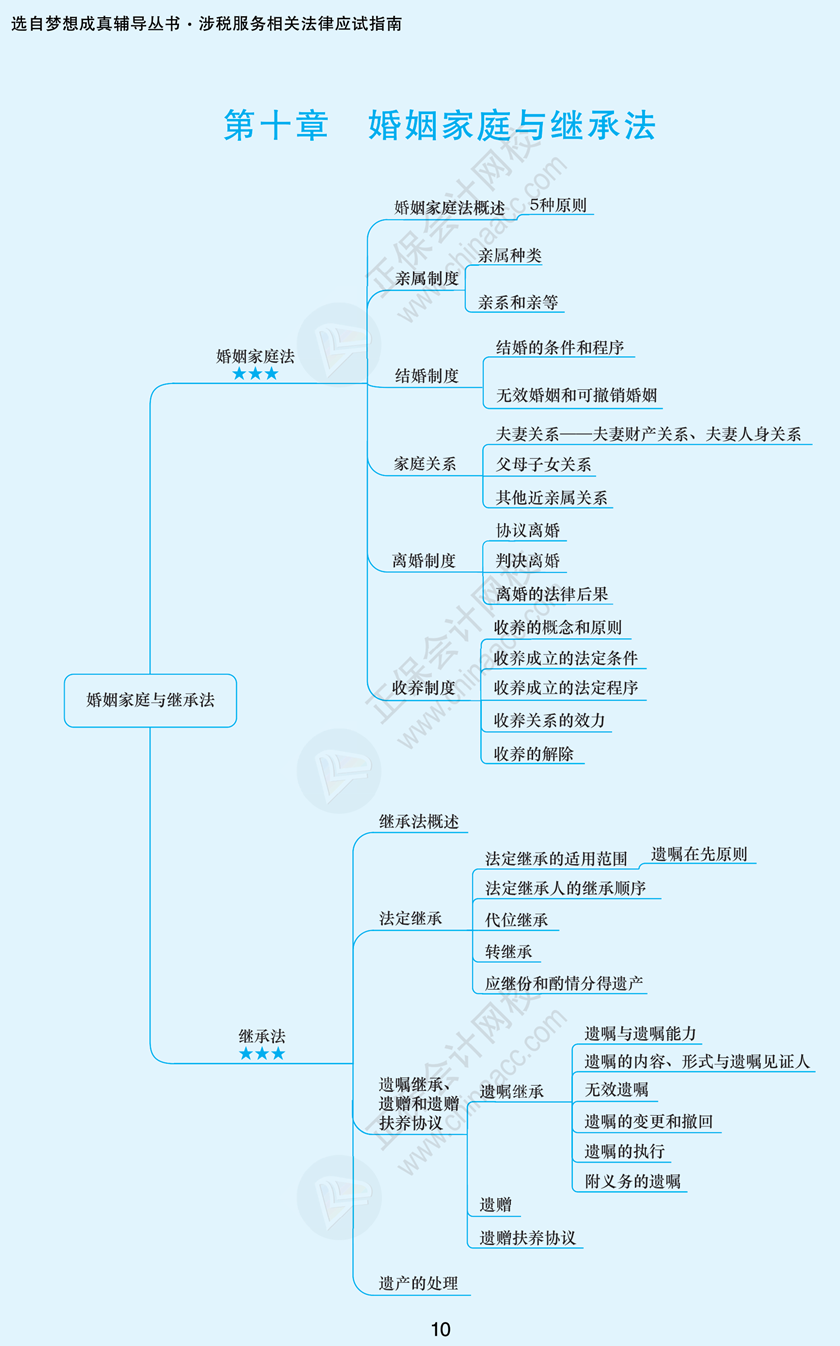 备考税务师,厚厚的课本,我们不能是简单的获取知识量和信息量,我们得抓住重点,提高学习效率。税务师应试指南辅导书里的思维导图,帮我们串联章节知识点,复习更有方向。下面是2024税务师《涉税服务相关法律》思维导图第十章:婚姻家庭与继承法。