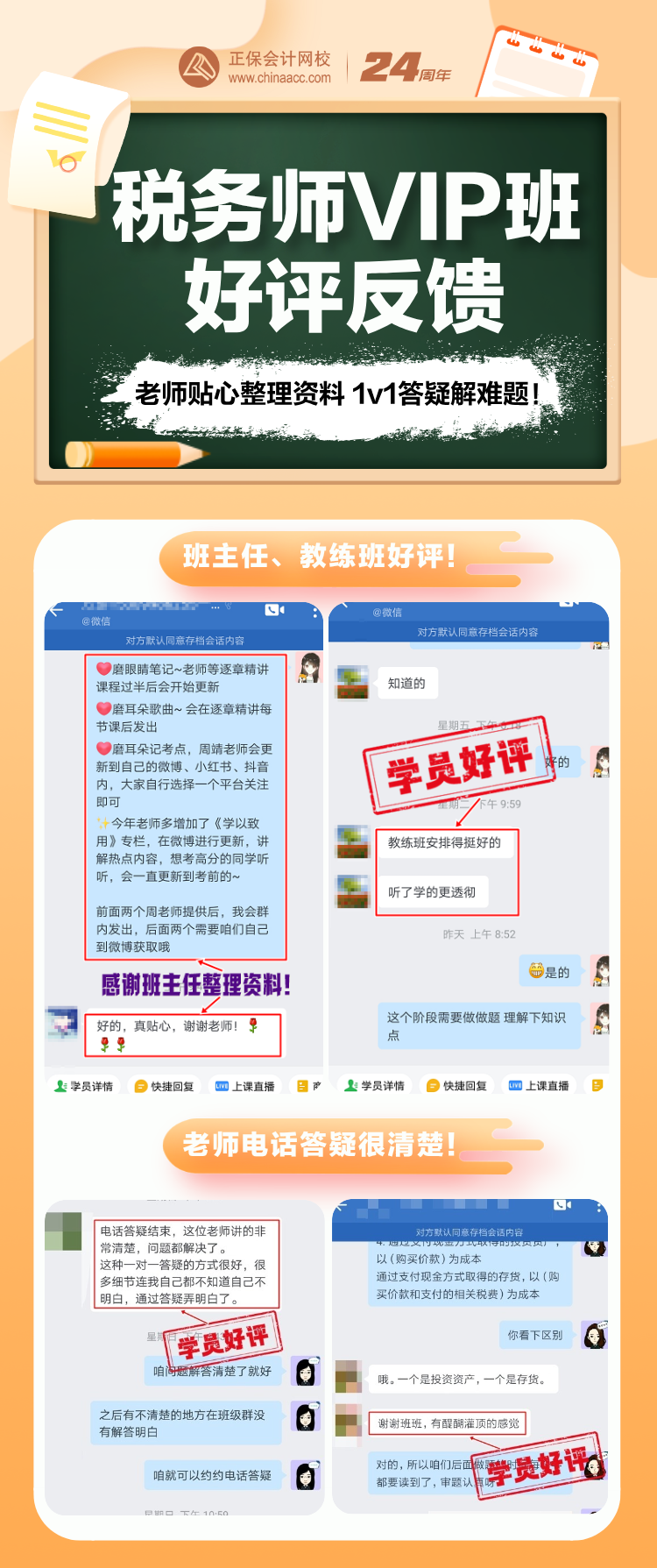 2024税务师考试时间越来越近,各位学员学习进度如何了?学习过程中一定要做题,去加深所学知识点的印象,巩固基础。VIP班全程直播授课,课堂老师面对面答疑,课后也有助学老师社群和电话等各类答疑服务,更有学管师陪伴督学,自制力差?基础薄弱?听老师的话,考试咱不怕!