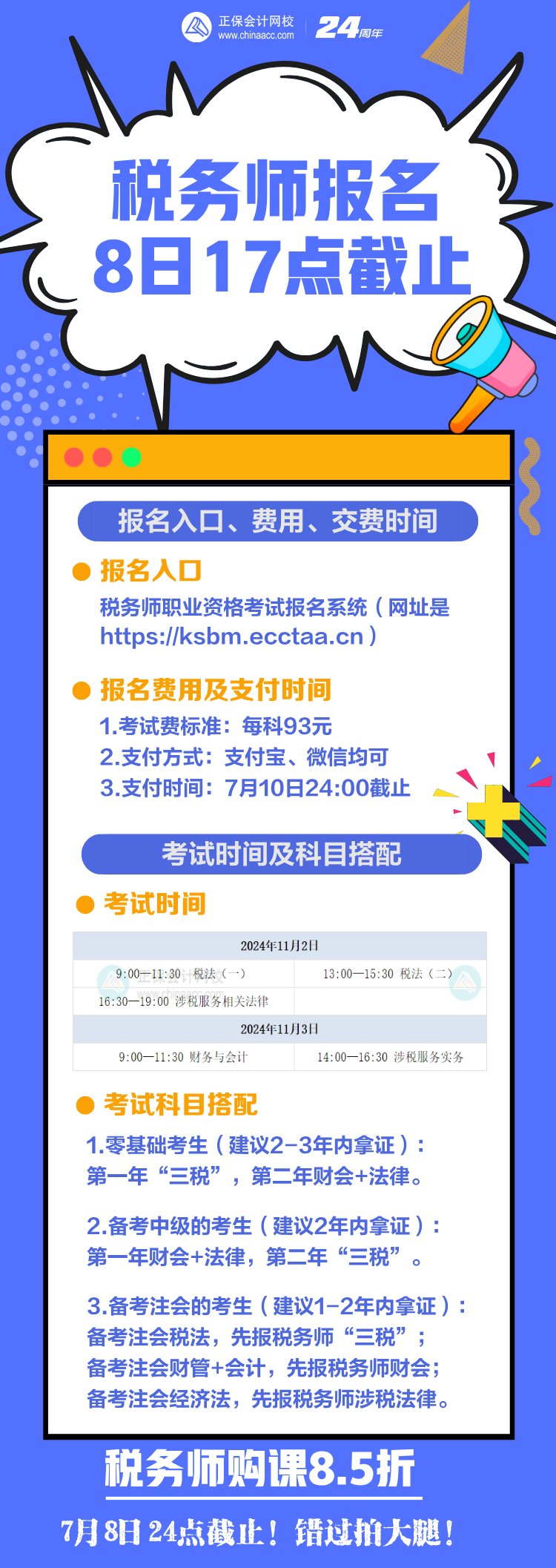 2024年税务师职业资格考试7月8日17:00截止报名,已报名的考生需要登录报名系统确认下是否报名成功,还未报名的抓紧时间报名!