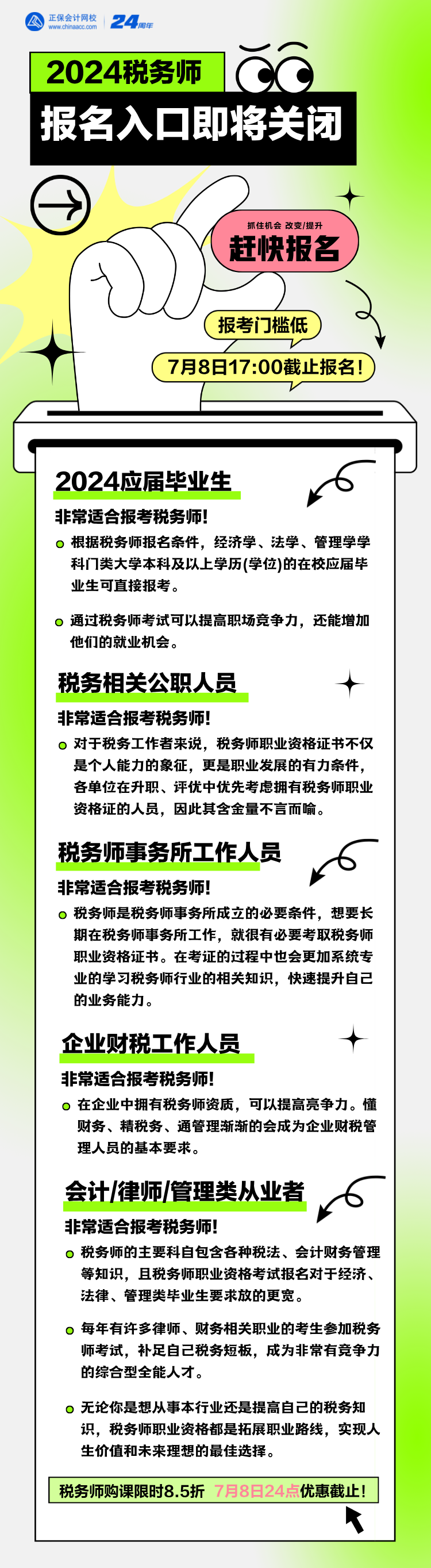 所以,赶上2024年税务师考试报名末班车,全心投入学习,当你拥有拿得出手证明自己能力的证书,你的职场生涯更长更远!