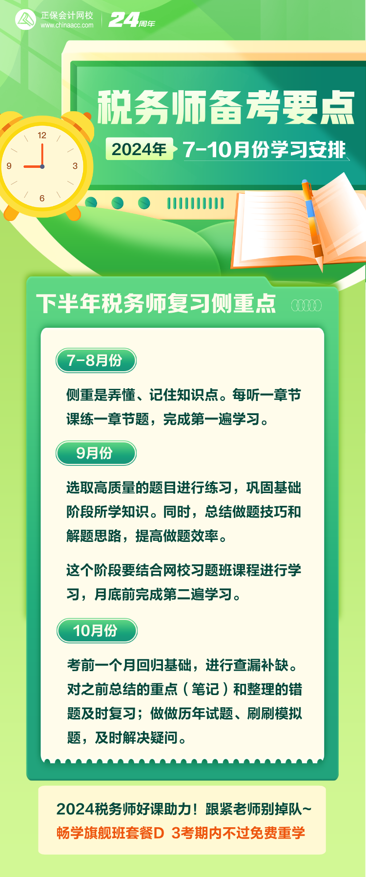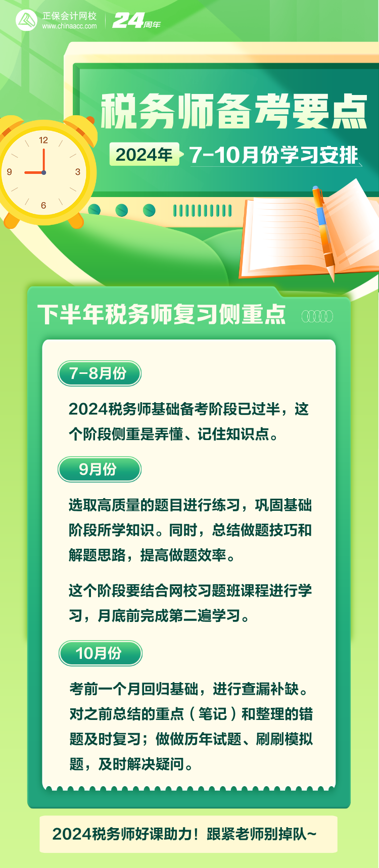 备考2024年税务师考试,经过一段时间的学习,相信多数考生已告别最初的“无从下手”,很多人基础班已学完一半了,那咱们还要知道下半年的备考要点,学习有目标、有方向,才能不做无用功!