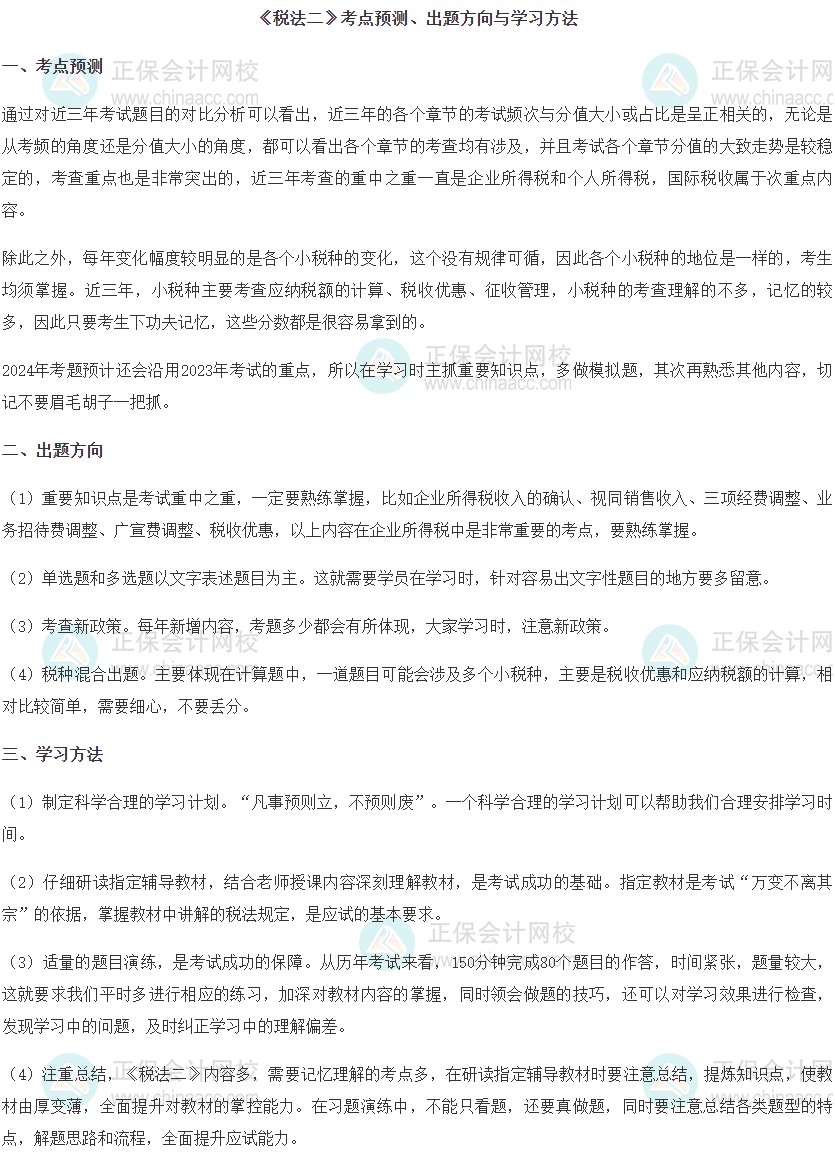 税务师《税法(二)》考点多,记忆量大,考生应依据考试大纲的要求,对考试教材中的基本内容全面掌握,融会贯通。在学习中要注意合理规划时间,注重学习方法,选择具有典型性的习题进行练习。