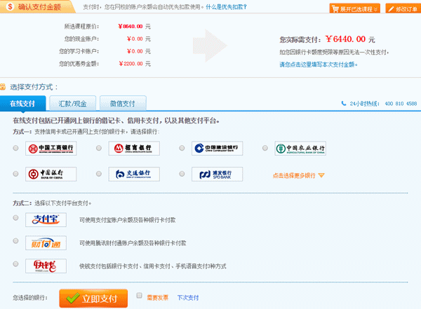 点击立即支付就可以选择支付方式进行支付了,目前支持网银、支付宝、汇款、微信支付。