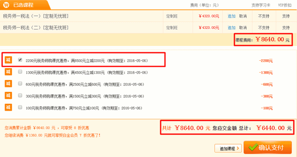 领取完优惠券,就可以进入选课中心选择你需要的课程了,选完课程后一定要手动勾选优惠券,否则是不减钱的。比如小保同学选择了税务师《税法一》、《税法二》的定制无忧班。原价一共是8640元,勾选了2200元优惠券后,只需支付6440元即可,是不是很优惠!!!
