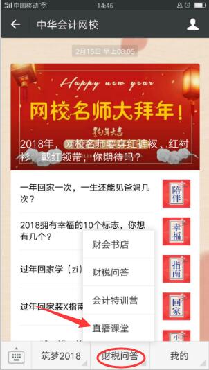 方式二:关注正保会计网校微信官方公众号,微信号:wx_chinaacc,点击菜单【财税问答】—【直播课堂】进入本次直播交流教室。