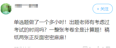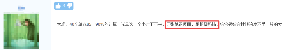 “太难,40个单选85-90%的计算,光单选一个小时下不来,四张纸正反面,想想都恐怖,综合题综合性跟跨度不是一般的大”