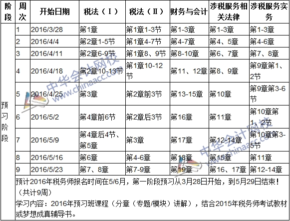 为帮助同学们尽快开始进行2016年税务师各科学习,正保会计网校教学专家制定了“2016年税务师考试预习阶段学习计划表”,以方便同学们对今后的学习进度进行全面控制,达到较好的学习效果。