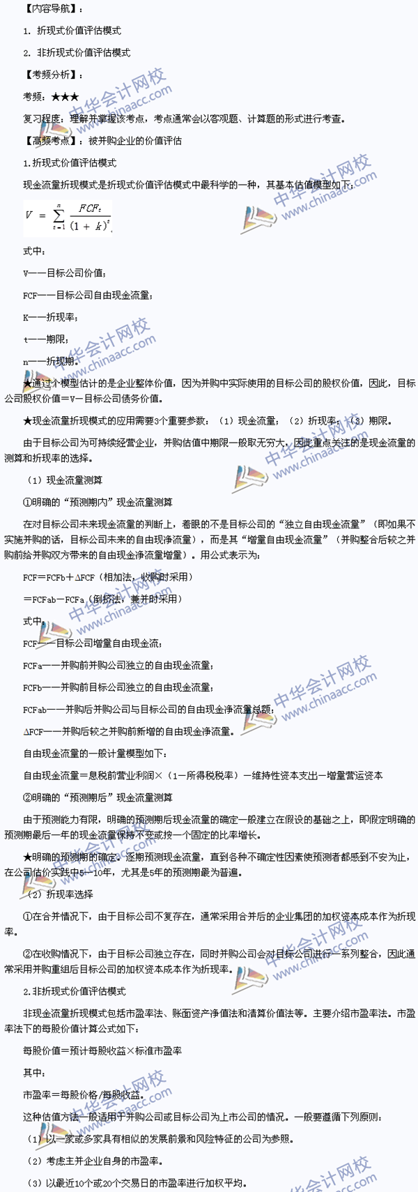 我们一起来学习2014《财务与会计》高频考点:被并购企业的价值评估。本考点属于《财务与会计》第六章资本运营第一节公司并购的内容。