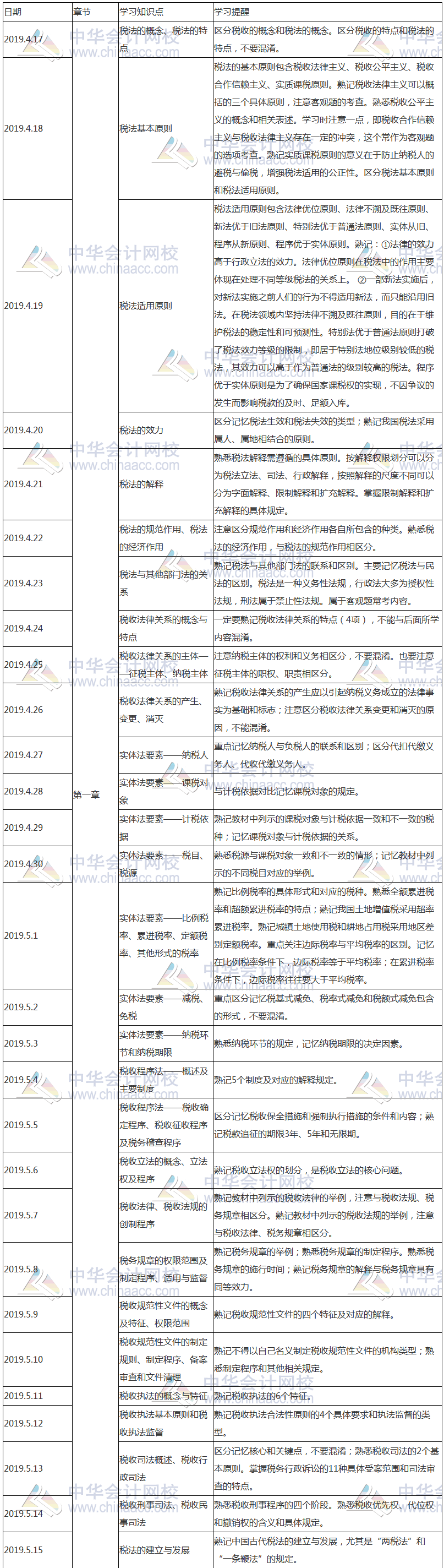 税务师考试大纲重中之重的增值税法内容调整较大。以下是2019年税务师考试《税法一》科目的具体时间安排,大家可以根据这份计划表合理安排自己的学习时间。