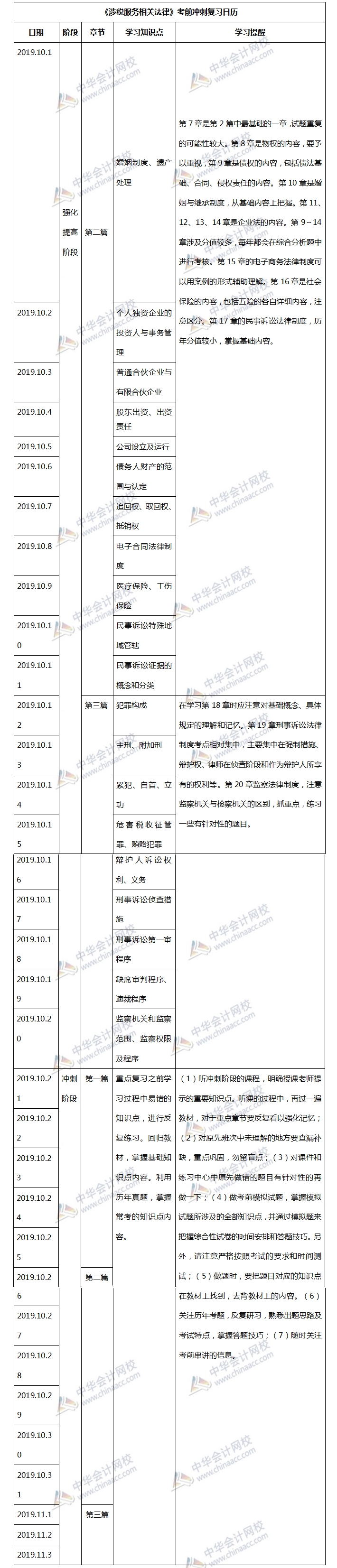 以上就是2019年税务师考试《涉税服务相关法律》考前20天冲刺计划日历表,大家可以根据自己复习的进度以及自己的具体情况来参考。如果有不懂的问题可以咨询网校客服以及老师,或者在论坛发帖与各位考友进行交流。>>点击进入论坛