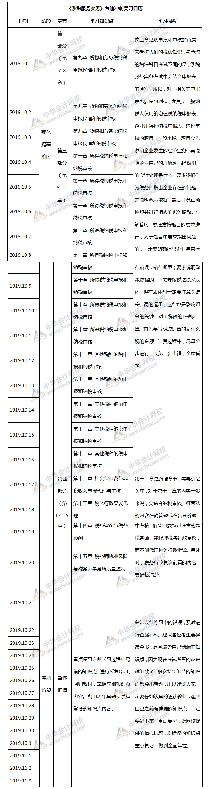 以上就是2019年税务师考试《涉税服务实务》考前20天冲刺计划日历表,大家可以根据自己复习的进度以及自己的具体情况来参考。如果有不懂的问题可以咨询网校客服以及老师,或者在论坛发帖与各位考友进行交流。>>点击进入论坛