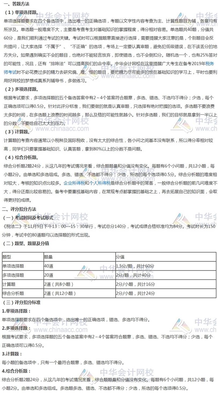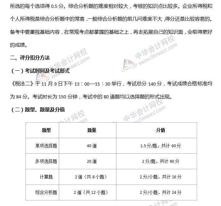 税务师税法二考试题型为单项选择题、多项选择题、计算题与综合分析题