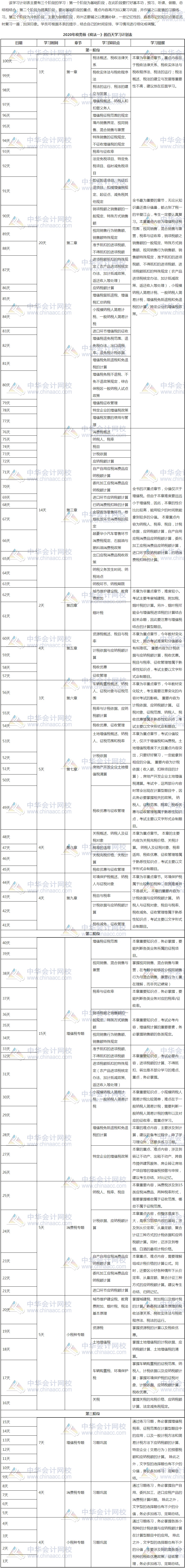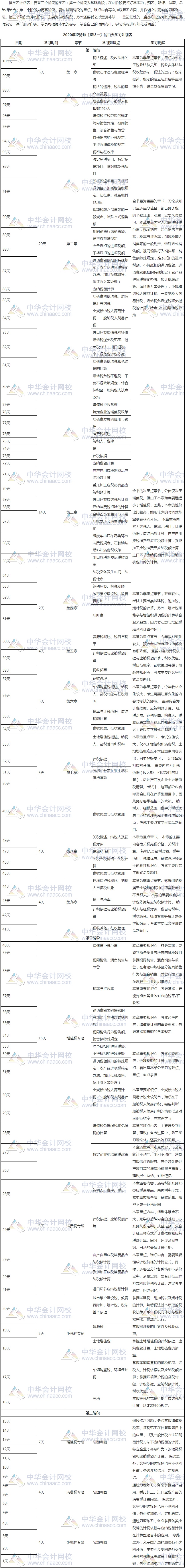 2020年税务师考试时间为11月7日-8日。税务师考试科目有五科,分别为《税法一》、《税法二》、《财务与会计》、《涉税服务相关法律》、《涉税服务实务》。网校特别为大家定制了2020年税务师《税法一》的百天学习计划表,拿好学习计划表,努力冲吧!