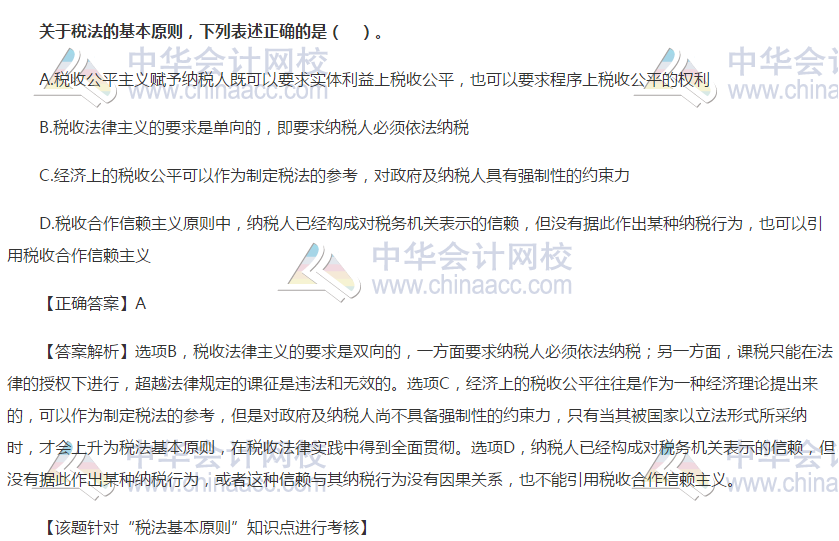 以下为2020年税务师考试《税法一》第一章——税法基本原则的单选题精选习题。